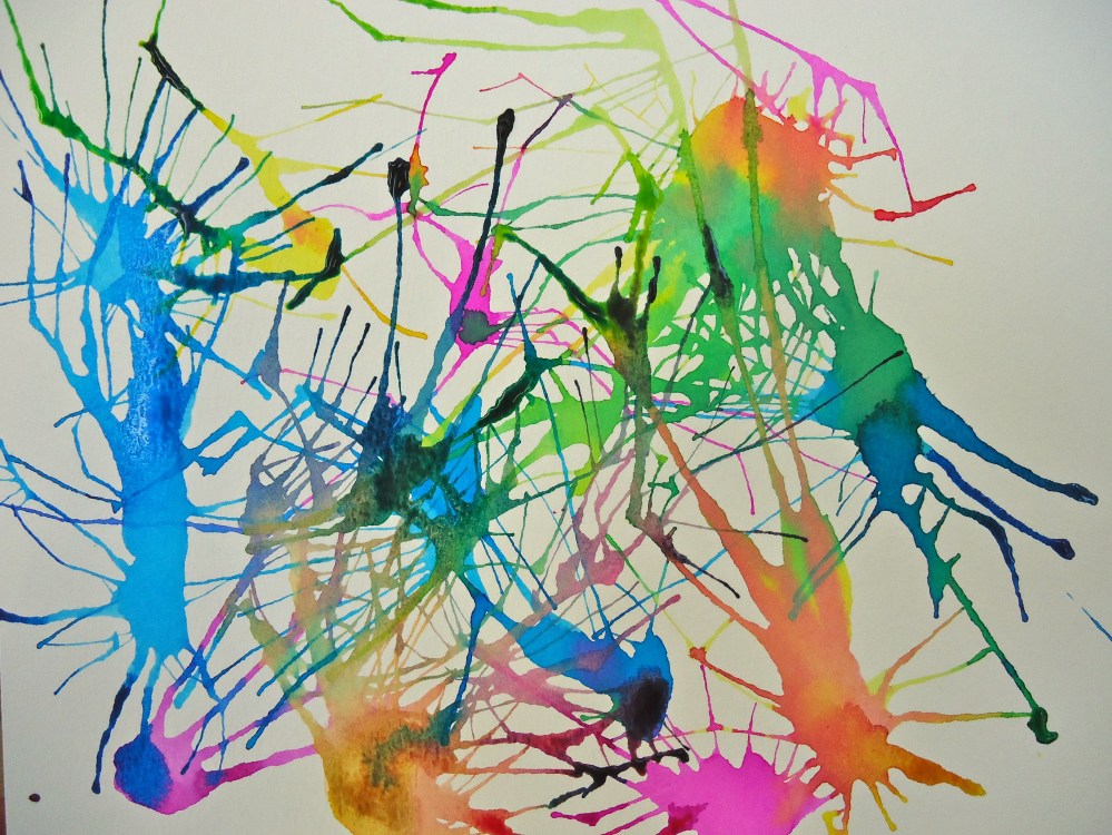 Materials: Although a watercolor set will work out just fine, I have used liquid watercolors for this activity because students need not wet the color cake first before applying the drops. In general, I find that the concentration of the liquid watercolor creates a more vibrant product. Watercolor paper will of course absorb the paint better allowing it to look its best, however for budget reasons and if you wish students to test out their technique on multiple papers, drawing paper will work out fine. I usually place all dry paintings under a stack of books overnight to keep the art from buckling. Smaller brushes work best since a larger puddle will create a less intricate pattern and more of blob when blown with a straw.