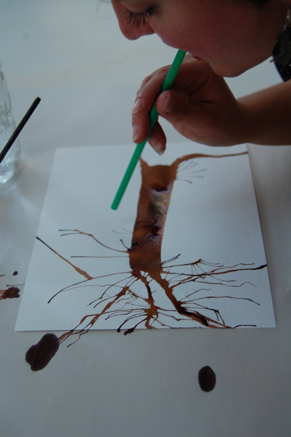 Lesson Development: Using only the primary colors with magenta and turquoise included, students explore blow painting and learn about how their breath force and direction have an effect on their creations. A few drops of colors are placed on the page using a small watercolor brush. The brush is then put aside and the straw is the primary tool. After the watercolor has spread, more drops are added and blown. The following class is focused around using their knowledge of blow painting to form a tree. A brush is used to paint the trunk and add bubbles on the top and bottom to form branches and roots. Connect this experience to observations of nature.