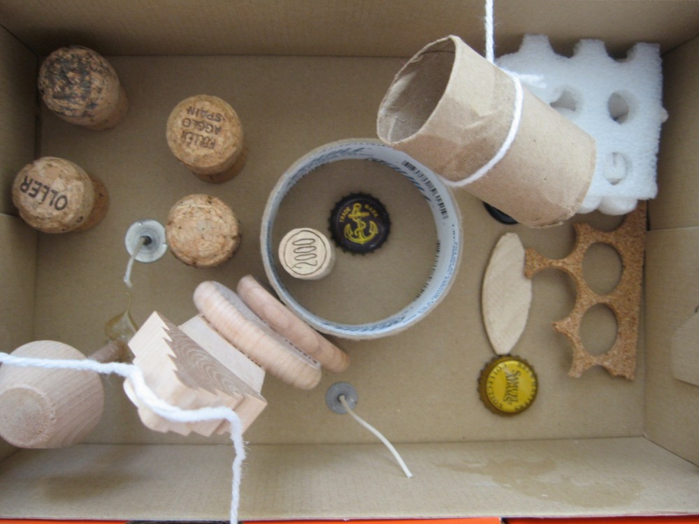 Materials: I keep a container in my kitchen for corks, bottle caps, paper towel rolls, cans and just about anything that I can clean easily and that will inspire a sculptural creation. The two assemblages in this post were created inside shoe boxes that were donated by a local shoe store. Local lumber yards may have wood scraps that you can salvage. I quickly brush over woods scraps with sand paper to remove any stray splinters waiting to happen. A strong tacky glue works best for this project and it is extra safe to have a low-temp glue gun handy to help make the impossible possible.
