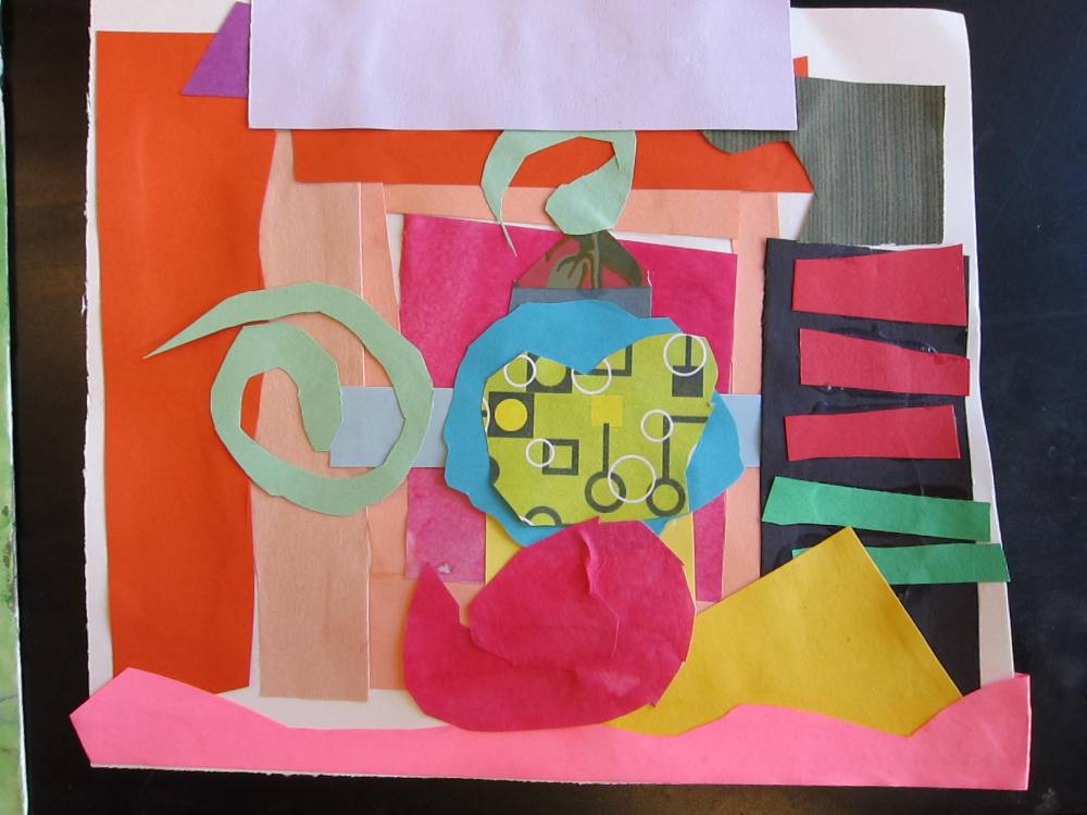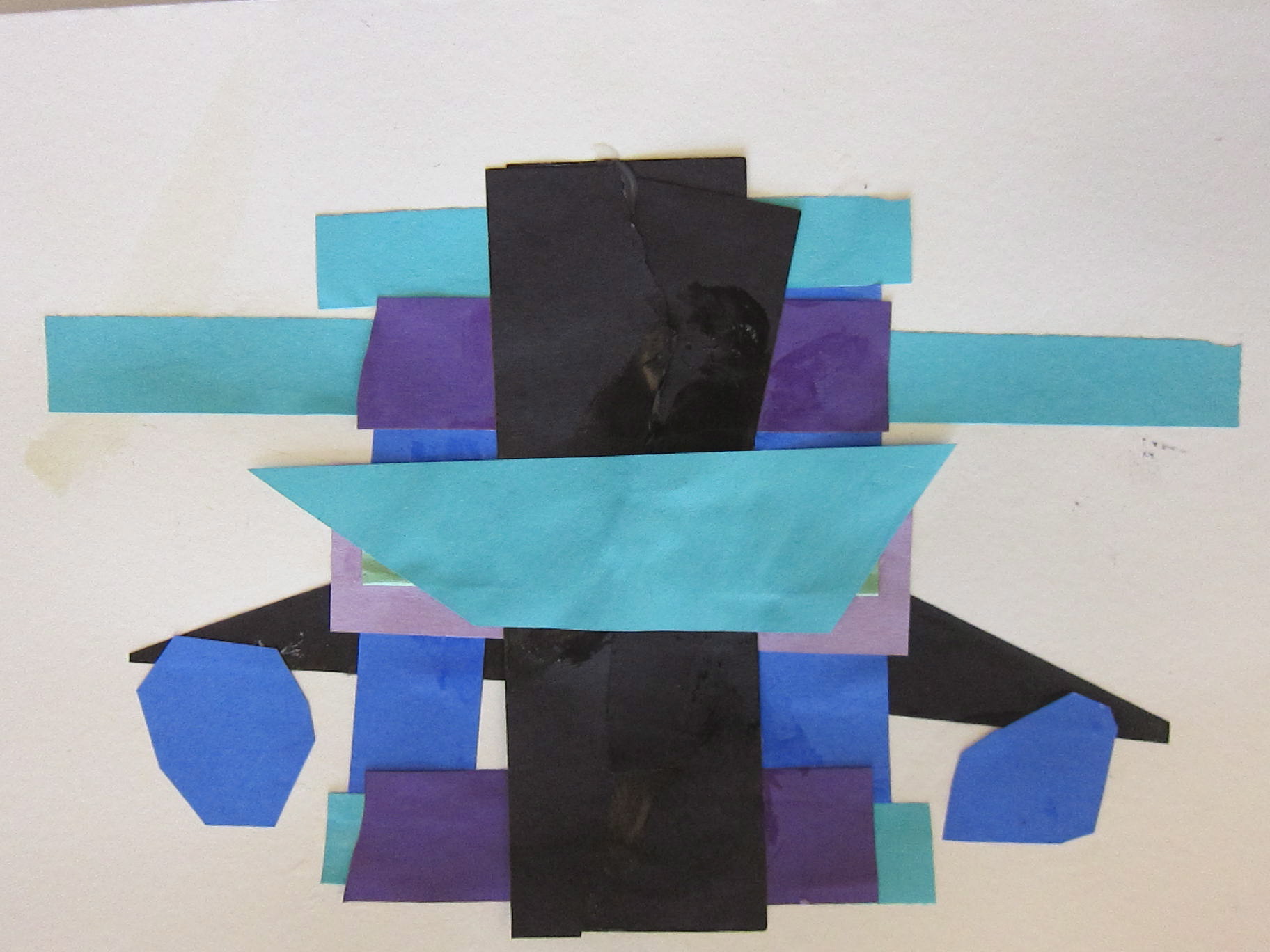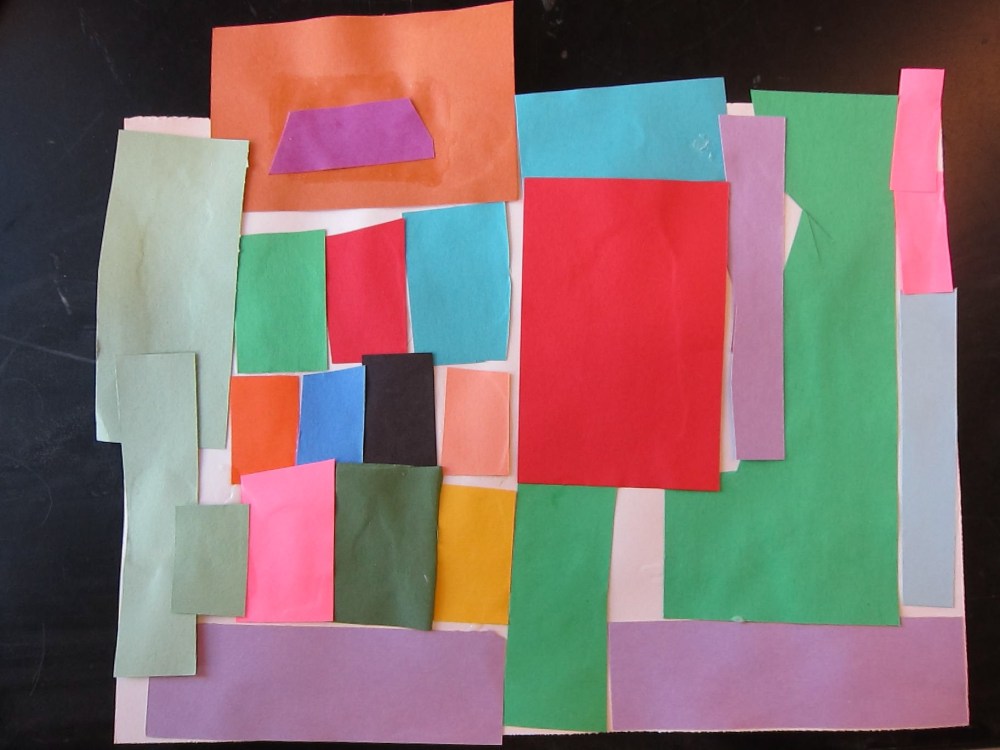 Materials: background paper of your choice no larger than 8 1/2 x 11in , cut paper shapes in various sizes and colors, glue jars, glue brushes, scissors.