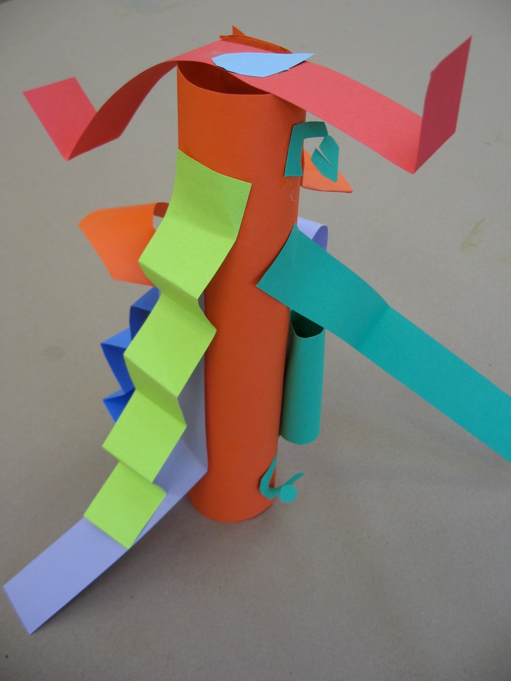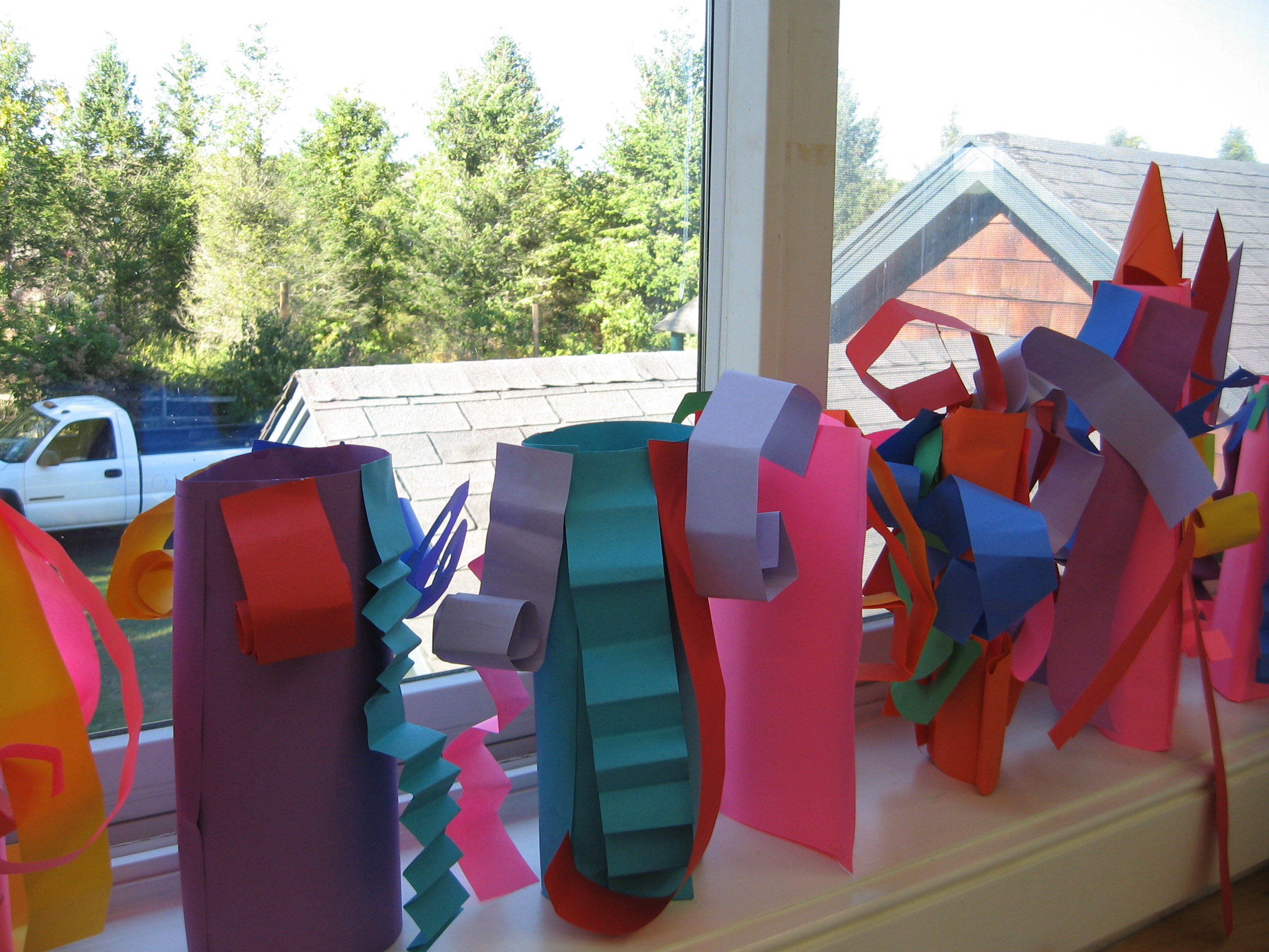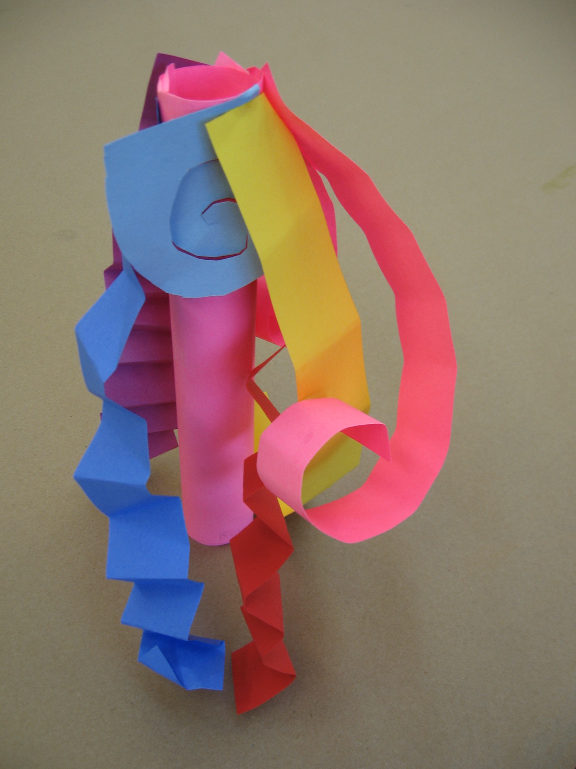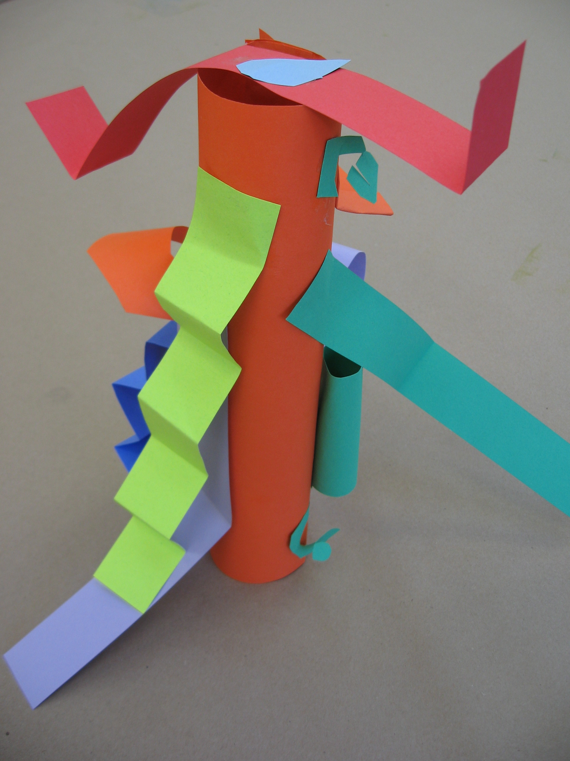 Motivation: I often begin this lesson by asking students if they have ever seen a 3-D film on the big screen. I then move onto a clarifying question and ask them to describe the difference between a 3-D and a regular film. Once we get to the idea that something 3D pops out, I ask them to show me how they think we can take flat paper and transform it into something that pops out, or is three-dimensional. I first demonstrate how to roll a cylinder. First place glue on the far edge then roll and tuck, hold still and stick. I also demonstrate how to fold a strip into accordion to create a zig-zag form, how to cut a spiral from a square that dangles in space. Students are sent to work independently to test these strategies as well as develop their own.