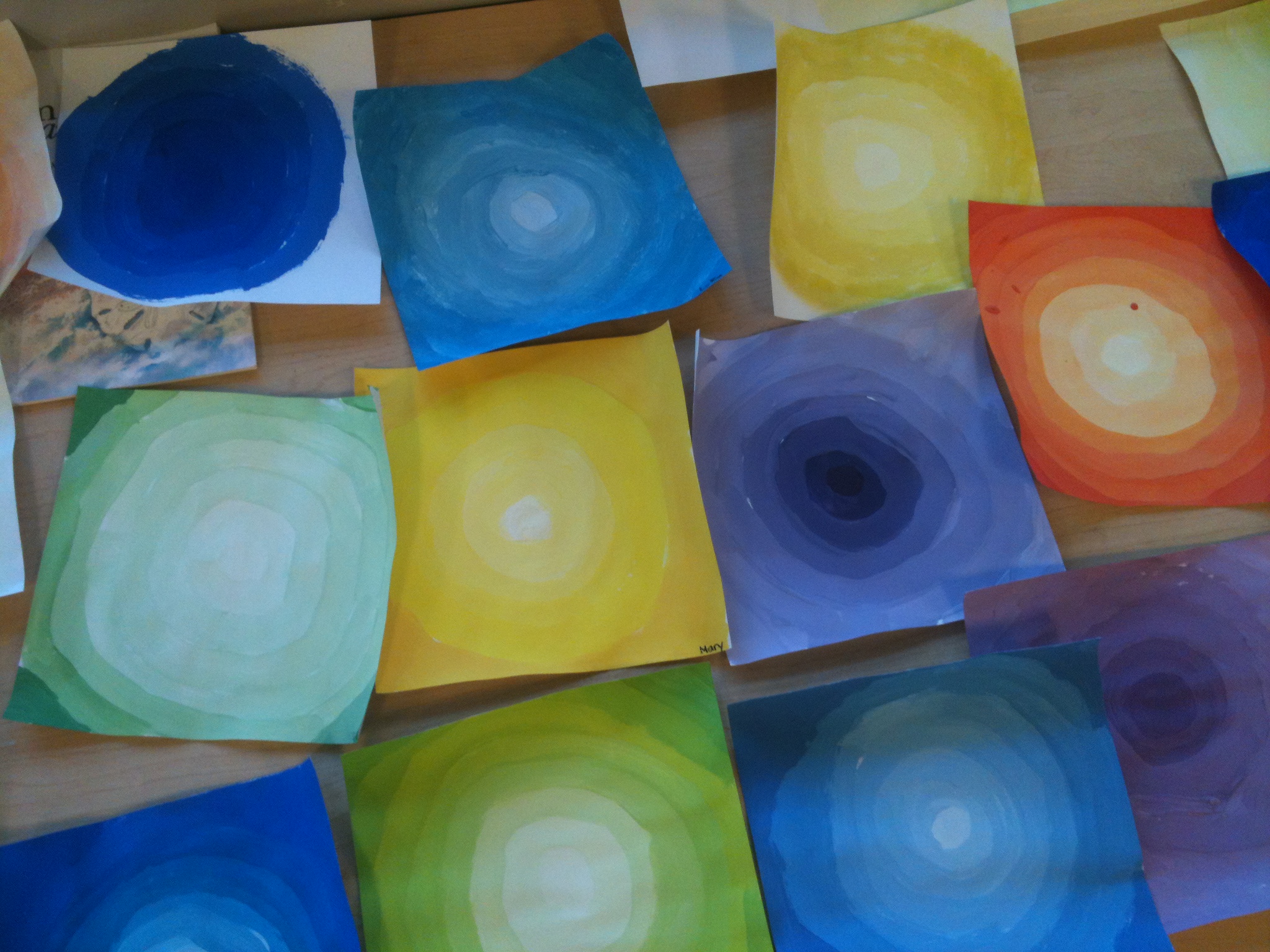 To jump start a painting unit, I had students explore hue and tints via concentric circle paintings. I wanted them to understand the difference between a hue and a tint, so we first mixed a hue using primary colors, then added the color to a pile of white a little at a time.
