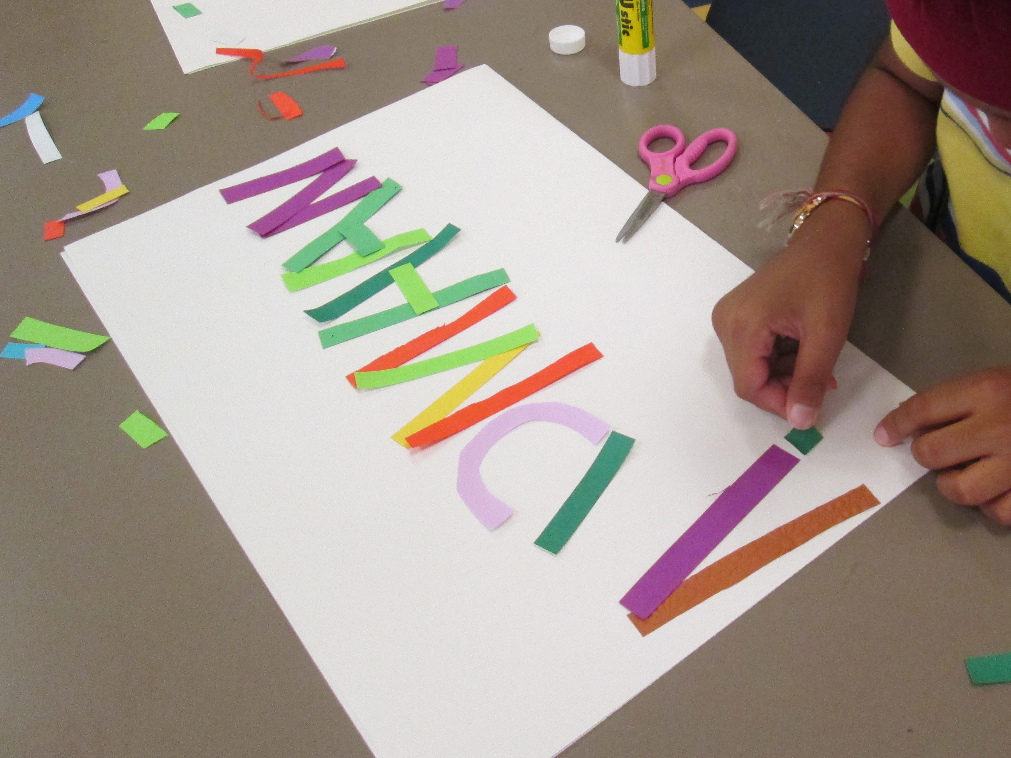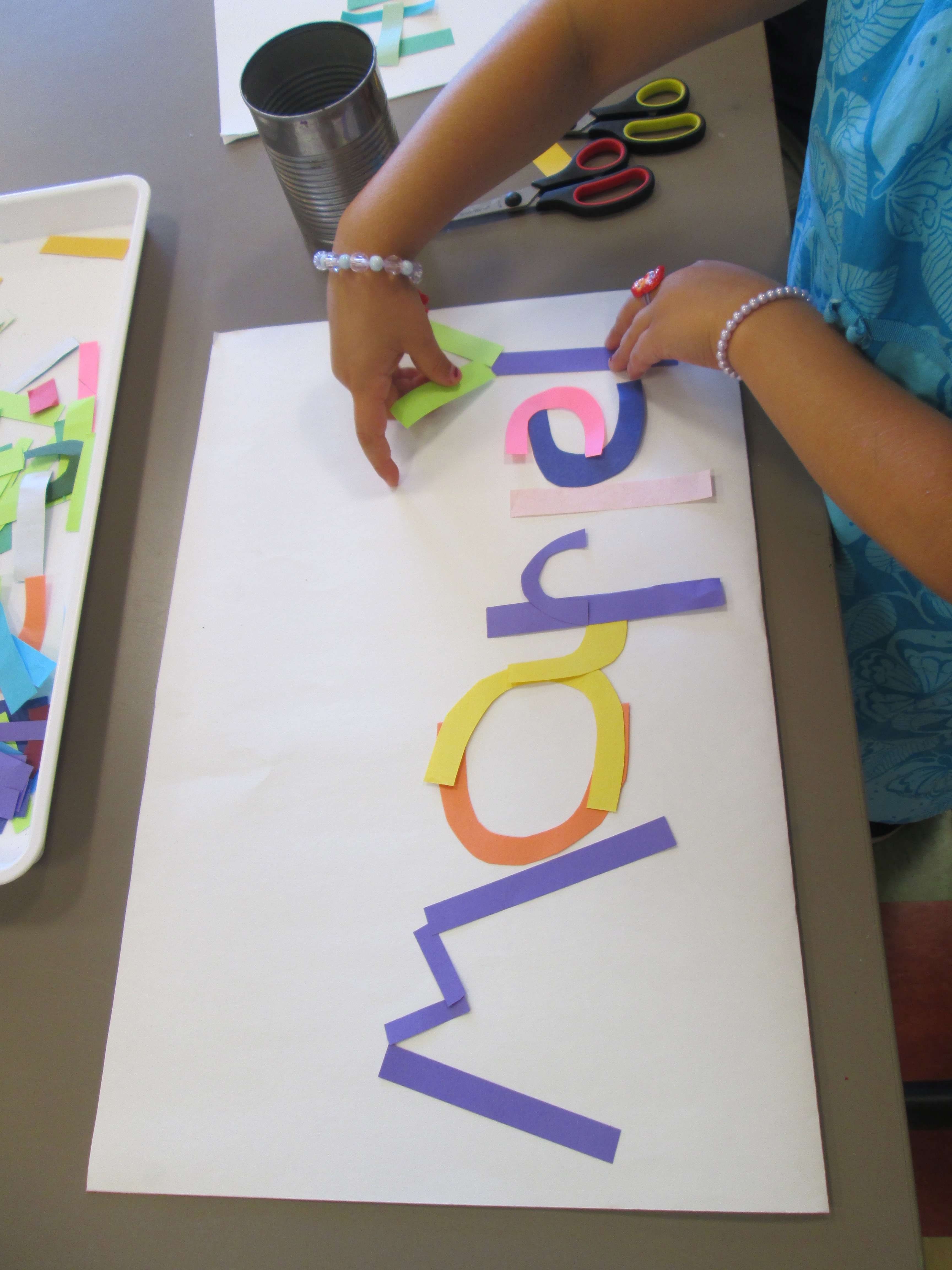 Younger students work well with pre cut lines that help them to form letters in a more concrete and clear way. I cut lines of various colors in curves big and small and straight lines, tall and short.