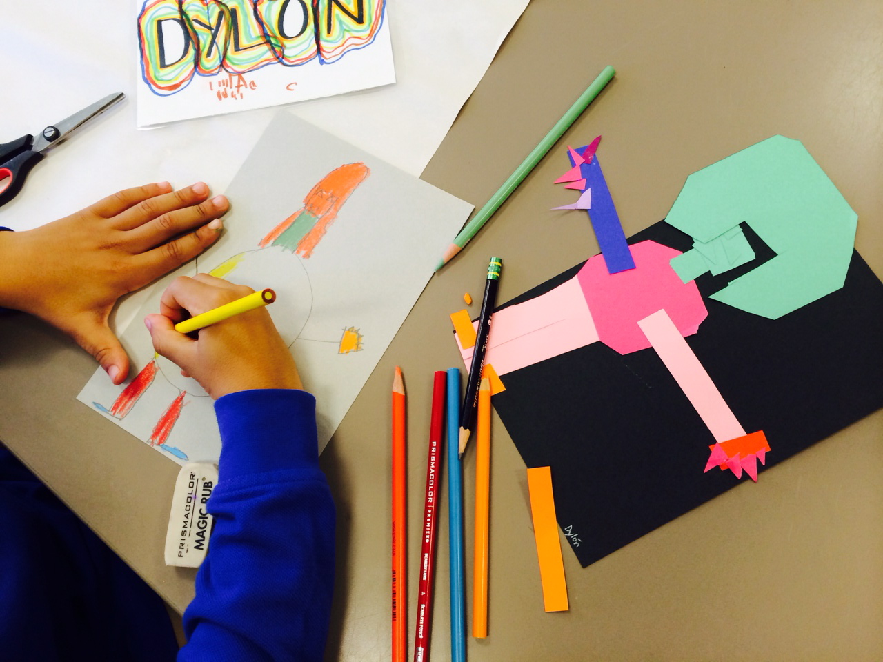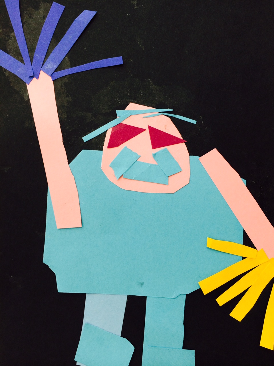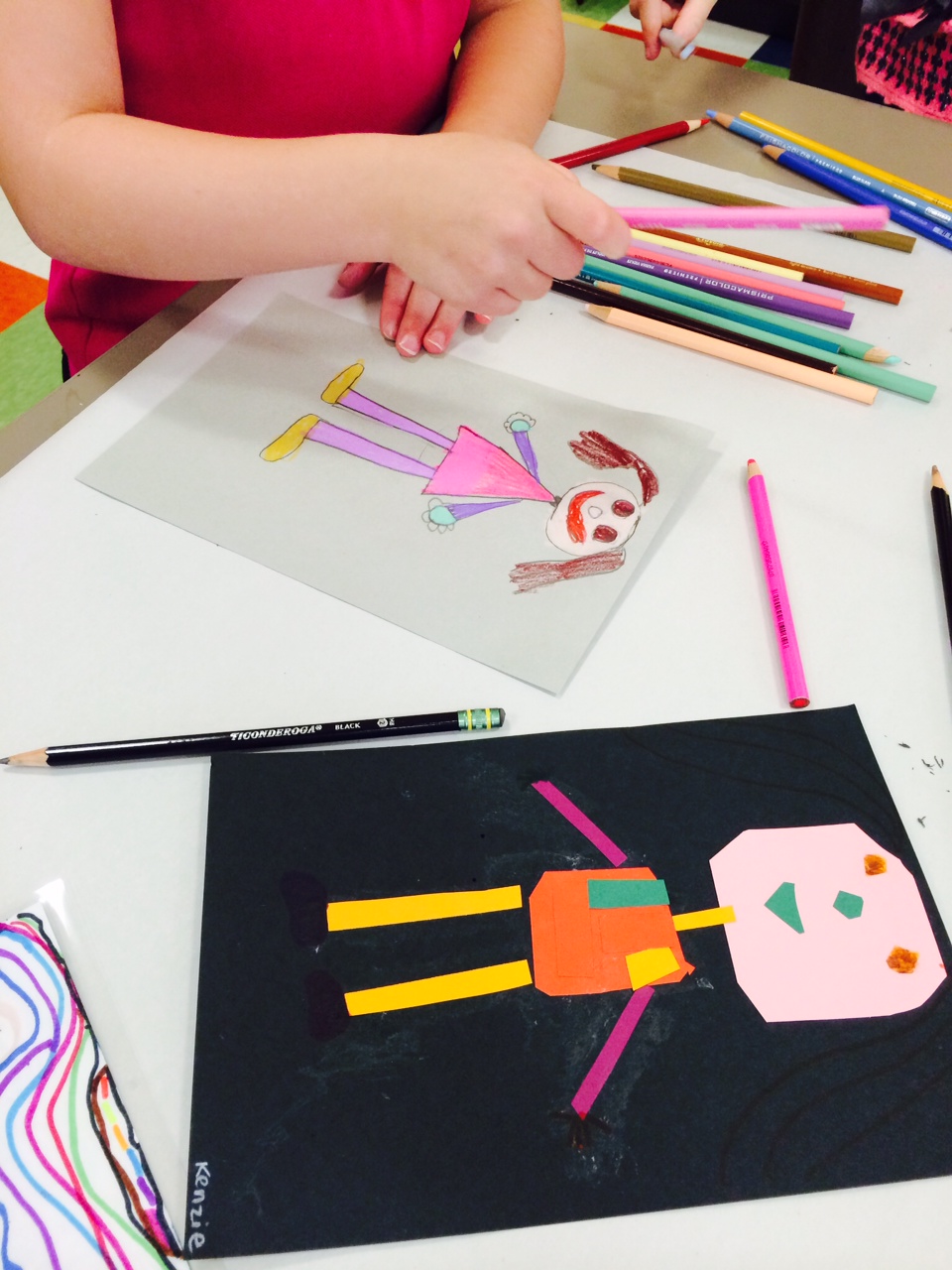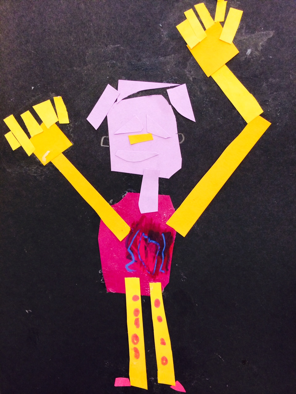Let me ask you this: If I gave you a pencil, could you draw a simple square? How about an oval? Now try a rectangle? Yes! I thought so. Children begin a second work of art in pencil. While looking at their collage, students illustrate a human figure beginning with simple shapes and adding color and details when necessary.